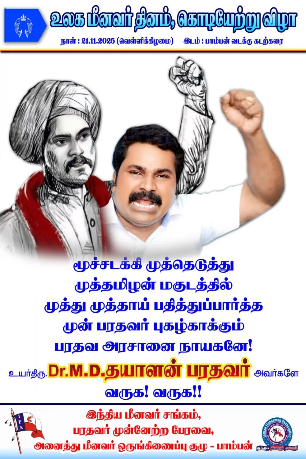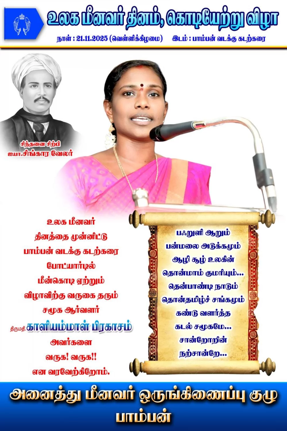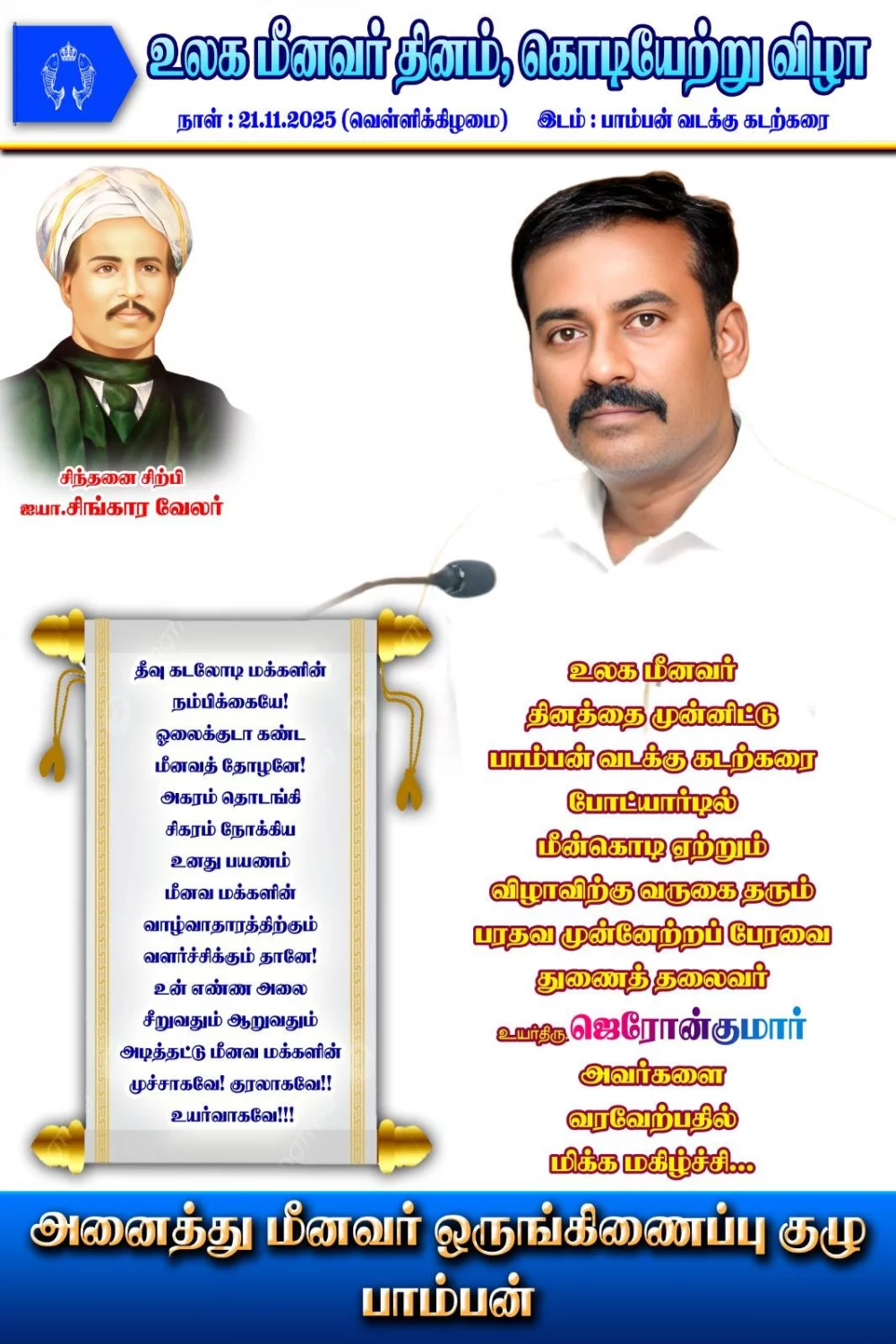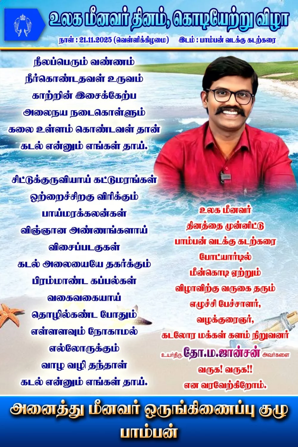 நவம்பர் 21 உலக மீனவர் தின விழா இடம்: பாம்பன் வடக்கு கடற்கரை.